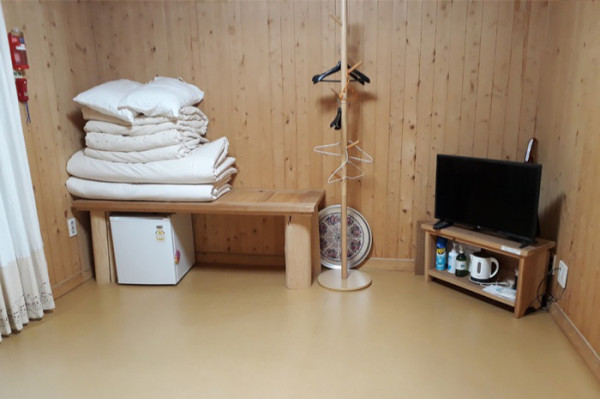 황토 구들장방에는 TV와 냉장고가 있습니다.